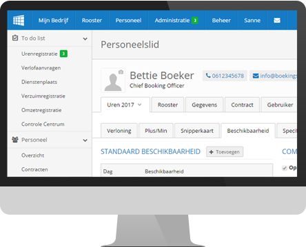 Klantenservice, boeking administratie en personeelsdossiers, zowel klant als medewerker ziet actuele informatie online.